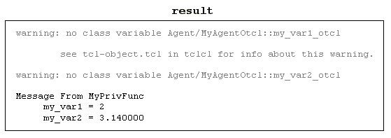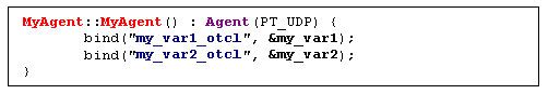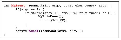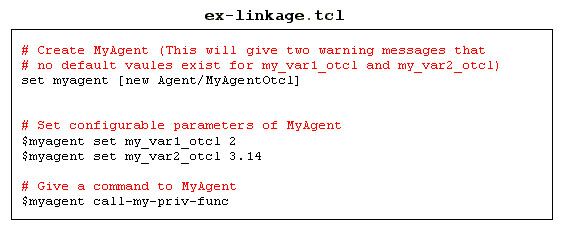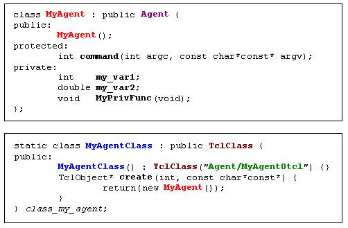 MyAgent類別中宣告了兩個變數(my_var1, my_var2)和一個函式(MyPrivFunc)。另外MyAgentClass是用來當作鏈結類別,連結C類別MyAgent到Otcl類別Agent/MyAgentOtcl。Agent/MyAgentOtcl前面的Agent/指明MyAgentOtcl是Agent下的一個衍生類別。當ns開始執行的時候會建立 class_my_agent物件,此時Agent/MyAgentOtcl類別和其相關的函式就會被建立在OTcl空間中。上面所提到的鏈結類別(static class開頭那段)可以拷貝到你開發的程式碼當中,只要將相對應的類別名稱(有顏色的部分,以及class_my_agent)做修改即可。